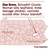 "All of the evidence we have to this point indicates that Hollie Gable did the four killings, but we don't know why,'' he said. "Everybody in Schuylkill County is shocked and horrified.'' The district attorney in neighboring Columbia County, Gary E. Norton, also was at a loss to explain. "We have no way of knowing why she did it, how, or if she planned it,'' he said. Cori did say that Gable might have had "a history of some mental health issues,'' but officials so far have been unable to confirm that. Police, as well as friends of the three children, speculated that Gable was using some kind of medication. As far as Cori knew, the custody battle over the children didn't play a role in the rampage. But as of yesterday afternoon, he hadn't had a chance to talk to Alfred Brown. "He is understandably distraught,'' Cori said. At the school yesterday, where everybody knows everybody, classes were held, but nothing was taught. Students were encouraged to visit with counselors and pastors in the school's library. Kirsten, friend Jasmine Morgan and her brother Kai Morgan recalled, was a talented singer and a good trumpet player. Kelsey, the youngest, was in the school's color guard and in the eighth-grade band. Jared was an avid hunter, a member of the school's chess club, and in Jasmine's Spanish class. A few weeks from graduation, he'd just been accepted at an art school. All of them were quiet, but friendly. None of them spoke much about their mother, but the consensus around the school was that Gable was "weird." Neighbors living about 50 yards away said they didn't know Kenneth Cragle very well, even though he'd lived on the property for seven or so years. As for Gable, "if we ever saw her, we didn't know her," the neighbor said. The gun used in the killings evidently belonged to Gable but was not registered in Pennsylvania, police said, and federal officials were tracing the weapon's ownership history. Gable's brief police record consisted of one arrest for retail theft. Cori didn't anticipate any charges being filed in the case. "We don't have a live actor, so we can't prosecute anyone,'' he said. The dead boyfriend, Cragle, has a son who escaped harm -- Scott Cragle was in Philadelphia for the weekend. (Bill Toland can be reached at btoland@post-gazette.com or 717-787-2141. Tom Barnes can be reached at tbarnes@post-gazette.com or 717-787-4254.)